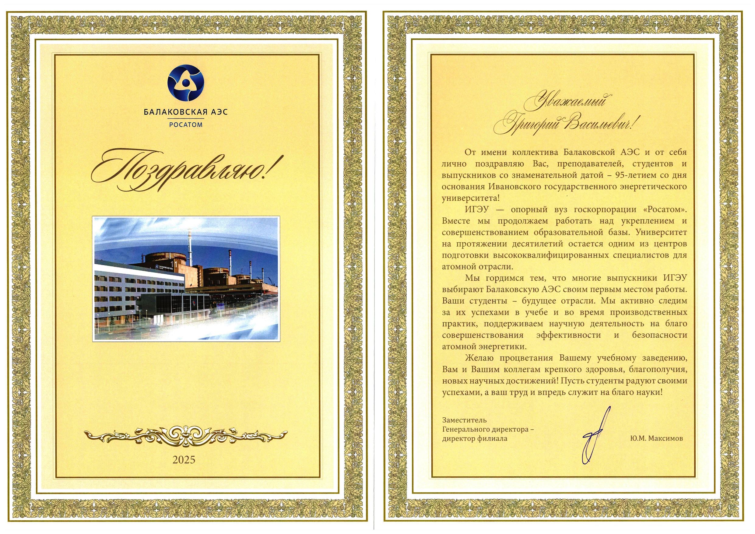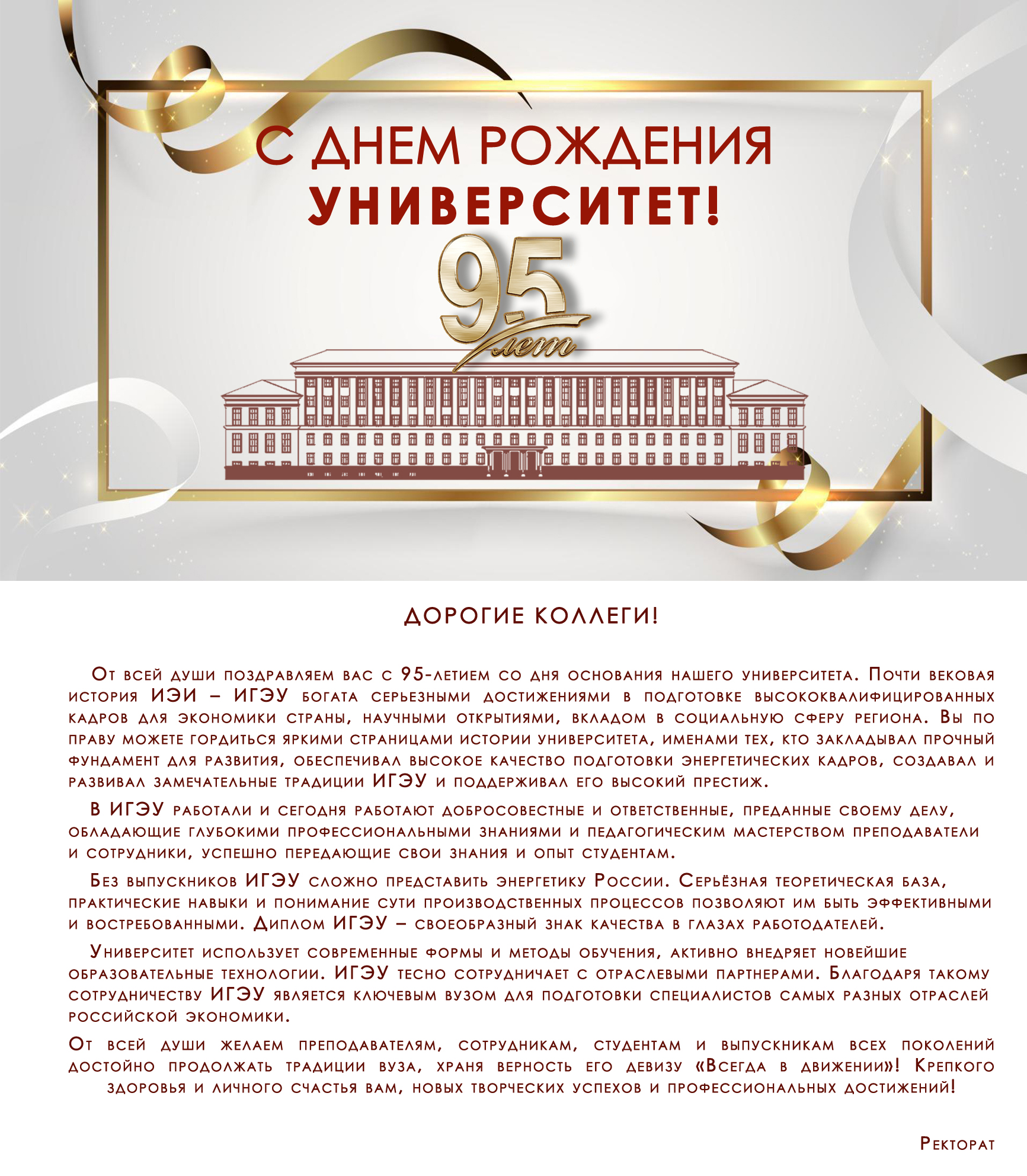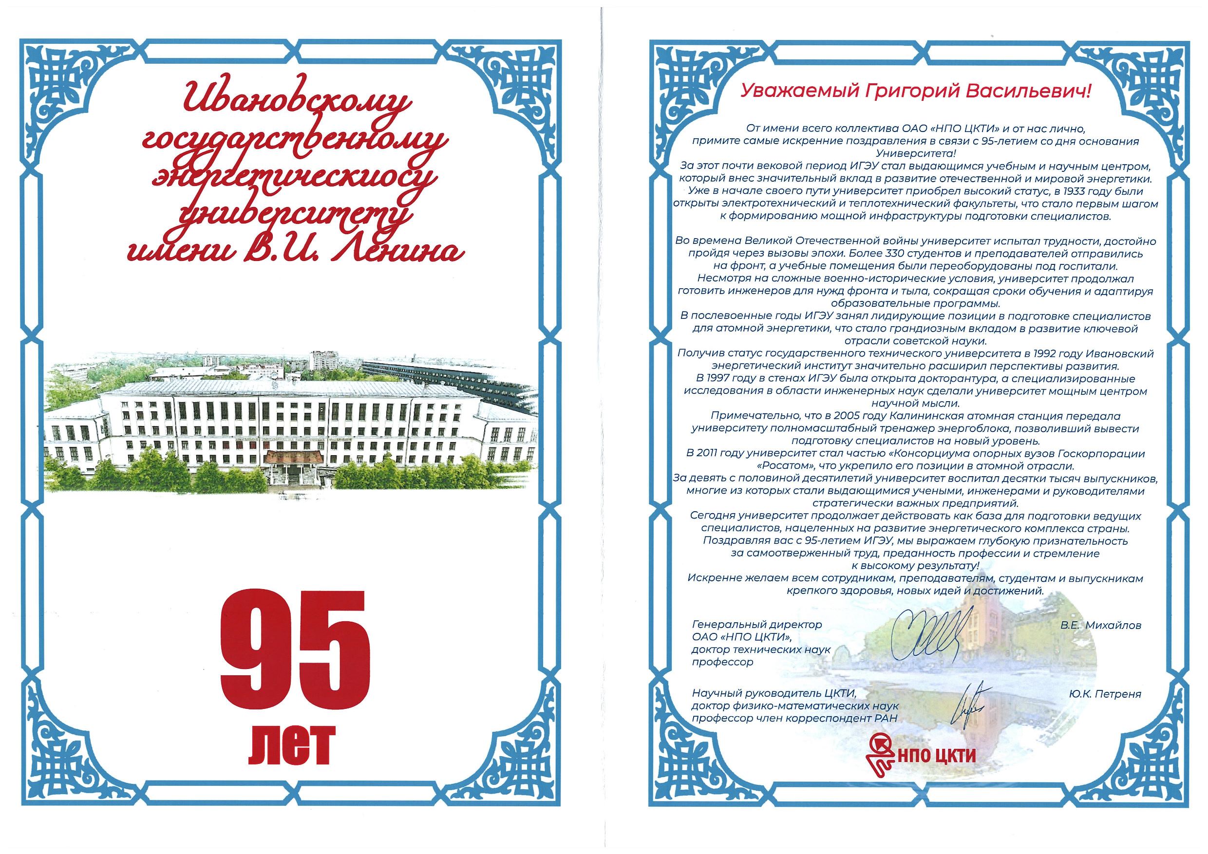 admin 28 November 2025 Дорогие коллеги, от всей души поздравляем вас с 95-летием со дня основания нашего университета. 234 просмотра Подразделение Ректорат Вложения Поздравление_Ректората ИГЭУ.jpg (1.53 МБ) Поздравление_Заместителя Генерального директора Балаковской АЭС.jpg (866.15 КБ) Поздравление_Генерального директора НПО_ЦКТИ.jpg (724.25 КБ) Категории Новости Главные новости